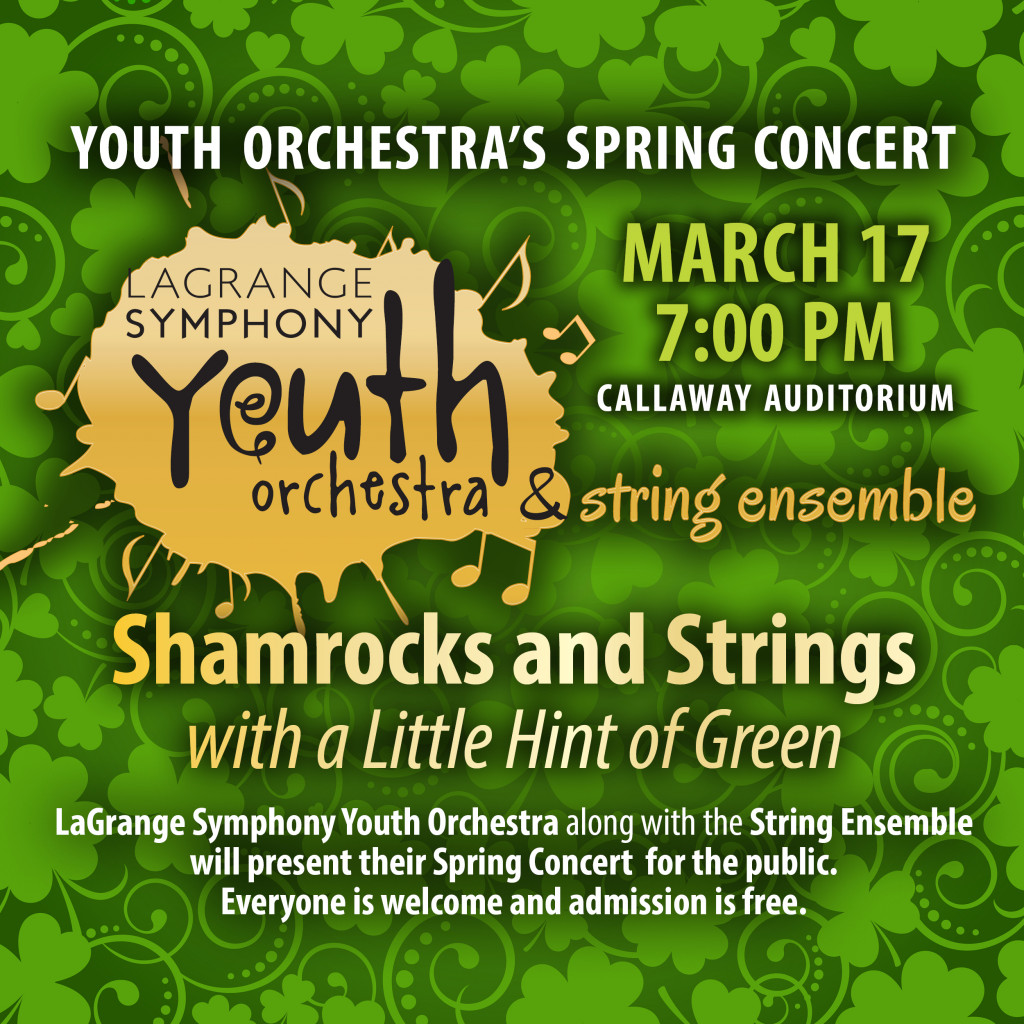 Celebrate St. Patrick’s Day with a touch of musical charm at the LaGrange Symphony Youth Orchestra and String Ensemble’s Spring Concert, Shamrocks and Strings—with a Little Hint of Green.” Join us on Tuesday, March 17 at 7:00 PM in Callaway Auditorium for an evening of lively and heartfelt performances by these talented young musicians as they bring the joy of orchestral music to the stage.