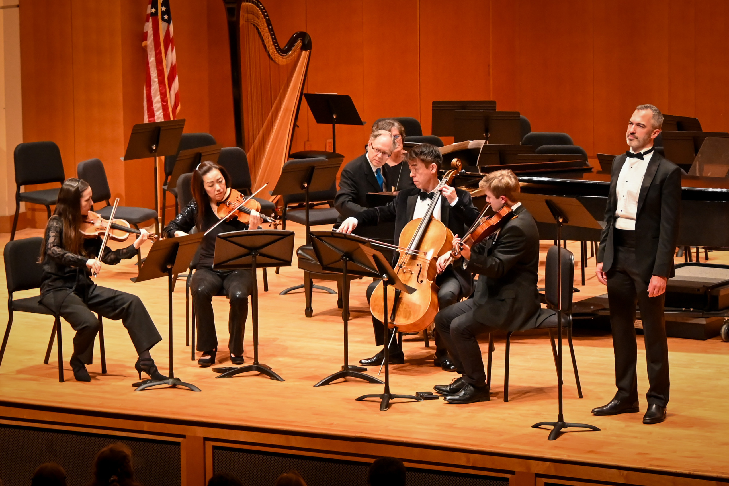 The program opened with three songs from Ralph Vaughan Williams’ On Wenlock Edge, performed by Pilkington, Ransom, and the Vega String Quartet. The orchestra graciously ceded the stage for this intimate set, allowing the audience to be drawn into the poetry and color of Vaughan Williams’ English landscape. Pilkington’s voice carried clarity and warmth, beautifully supported by Ransom’s sensitive piano work and the Vega Quartet’s musical textures. The result was an evocative and deeply human opening—music that felt like shared storytelling.