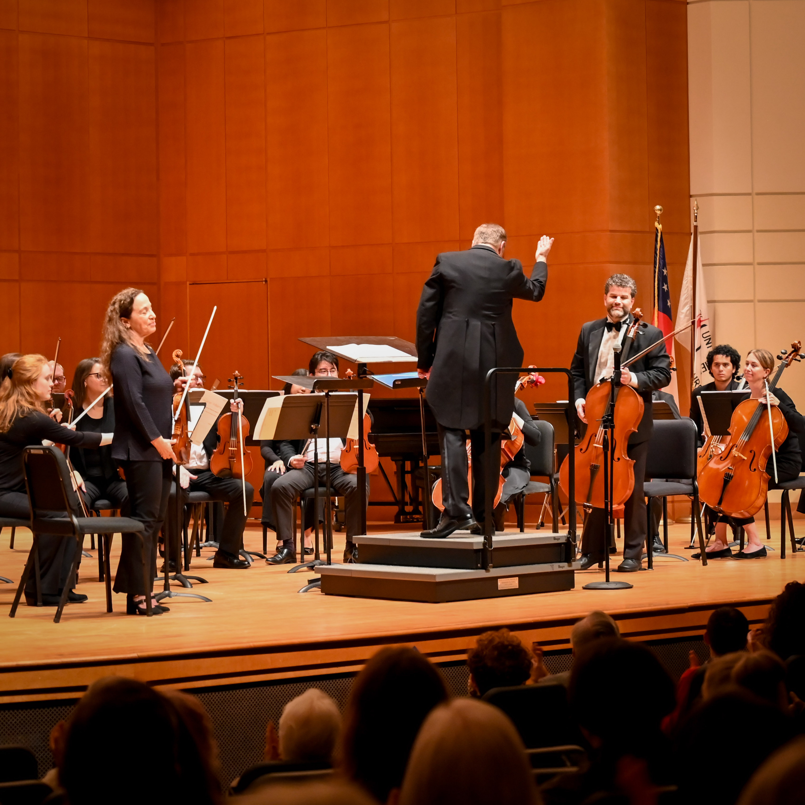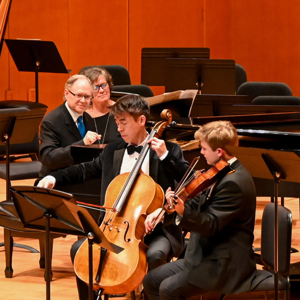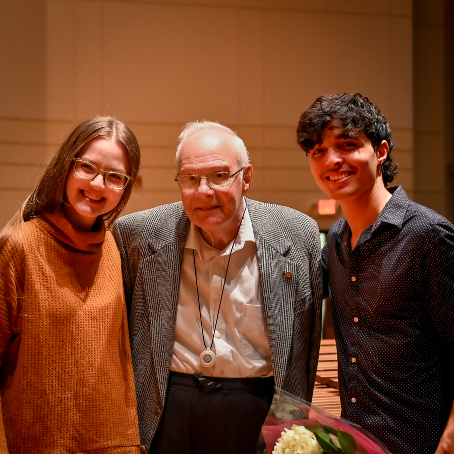 As the final notes faded, the audience immediately rose without hesitation in a long, enthusiastic standing ovation, complete with cheers and shouts of appreciation. Sebastian returned to the stage for a second bow, clearly moved by the response. His wife, who was in attendance, stepped forward with a beautiful bouquet of flowers, a simple but touching gesture that perfectly captured the joy and emotion of the moment. Following the concert, the atmosphere remained as uplifting as the music itself. Many audience members lingered to visit, including Dr. Paul Vaillancourt, Professor of Percussion at Columbus State University’s Schwob School of Music and several students. A particularly touching moment unfolded as Austin Cook and his family warmly greeted Sebastian and his wife. It was a fitting close to an evening defined by artistry, gratitude, and connection—a celebration not only of strings, but of the ties that bind a community through music.