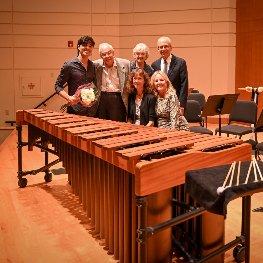 Sebastian Ocando and Austin Cook are pictured (left) with extended family and the donated marimba.